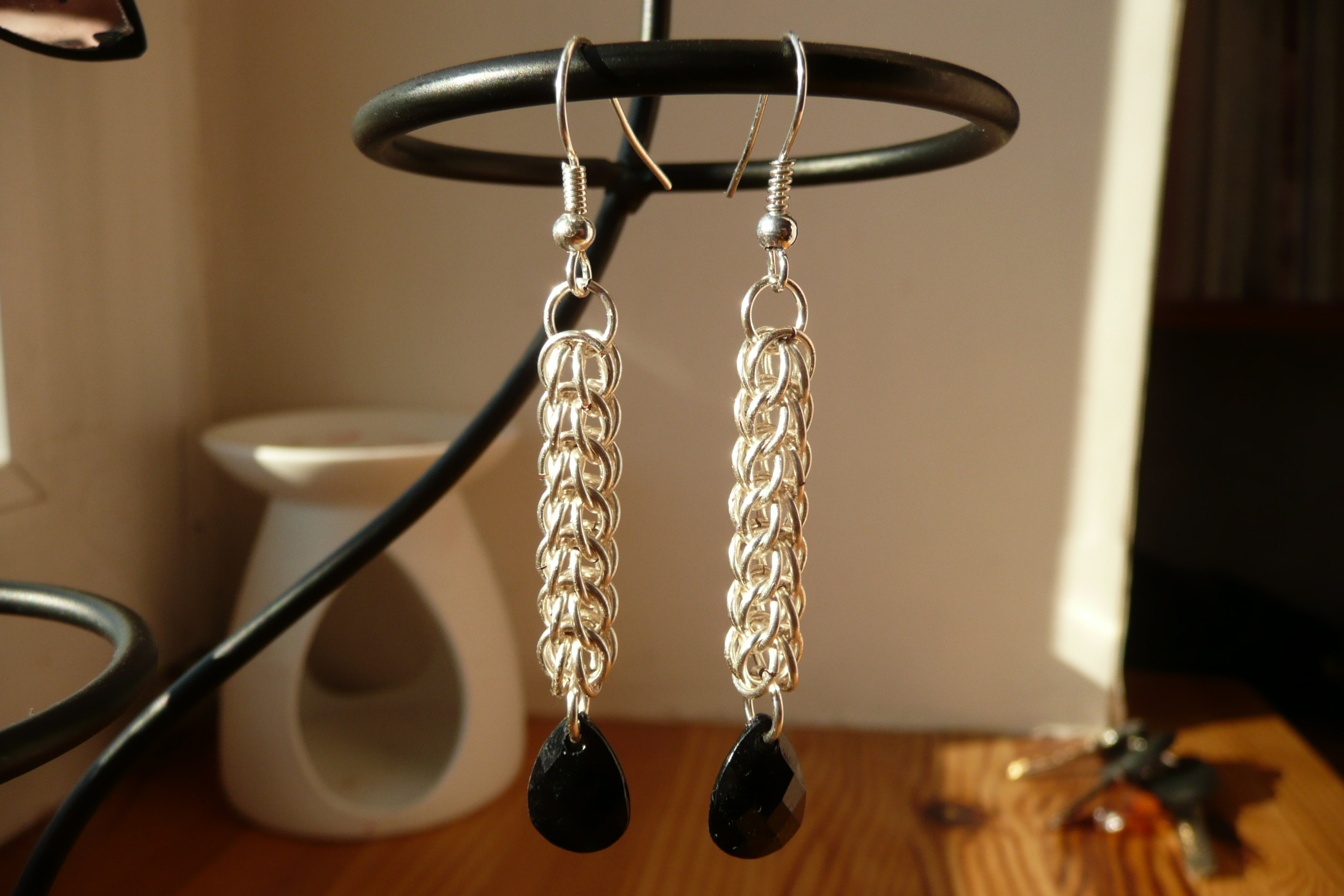 Nägin netis pilti hullult ägedatest kõrvarõngastest ja pidin kohe proovida. Neti omad olid tehtud mustade hästi pikkade pulkadega, mina proovisin ketijuppidega. Kasutasin ketijuppe, 11/0 sterlinghõbedast seemnehelmed on kettide vahel ja ehtenõeltega on kogu kupatus kokku monteeritud.